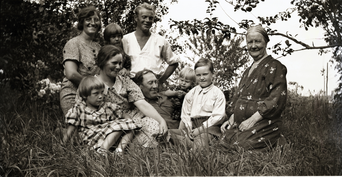 Karl Larsson i Albäck med familj i gröngräset; dottern Karin på magen, frun Selma med dottern Margit bredvid honom och sonen Gunnar bredvid sin farmor. Till vänster sitter Selmas syster Alma Rosengren, troligen med barnet Asta.