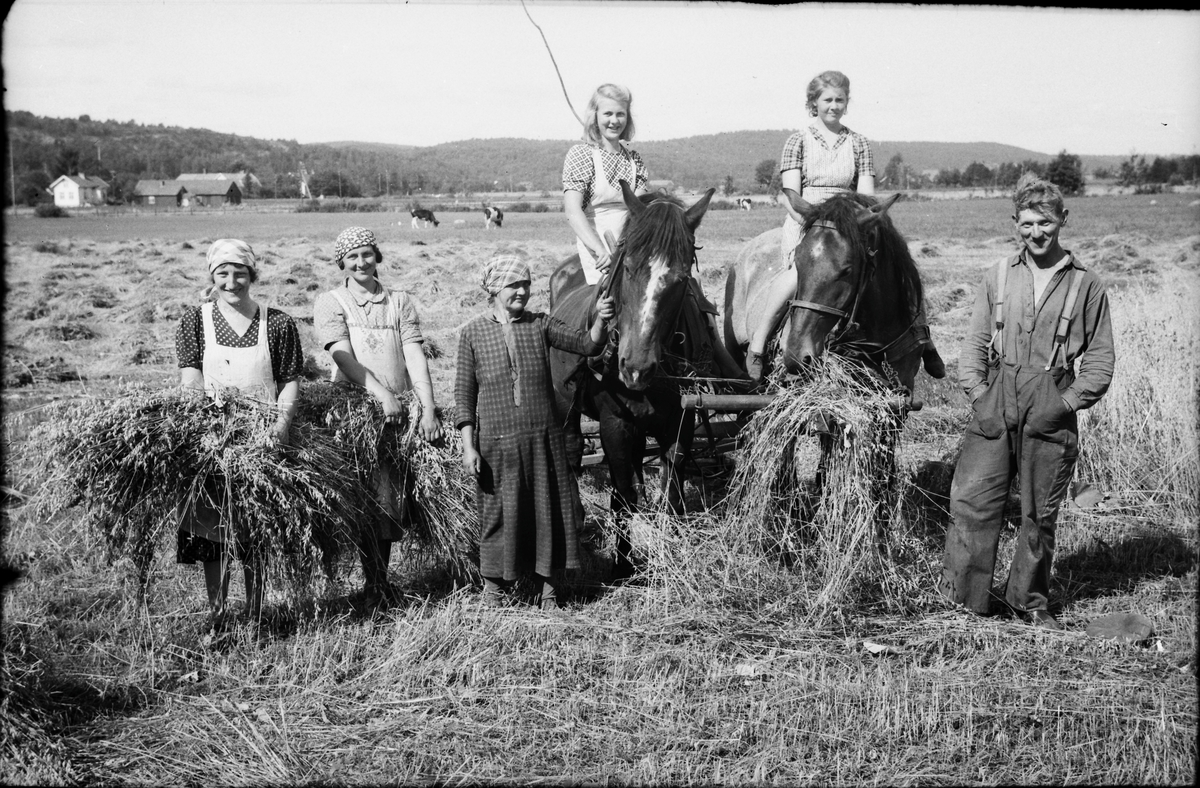Skördearbete i Veddige Nykvarn med två hästar med flickor på. Två kvinnor har famnarna fulla av den avslagna säden. Bengt Rosengrens gudmor Greta håller hästen, mannen till höger heter Gunnar och flickorna Berta, Hilma samt Alma (en ej namngiven)