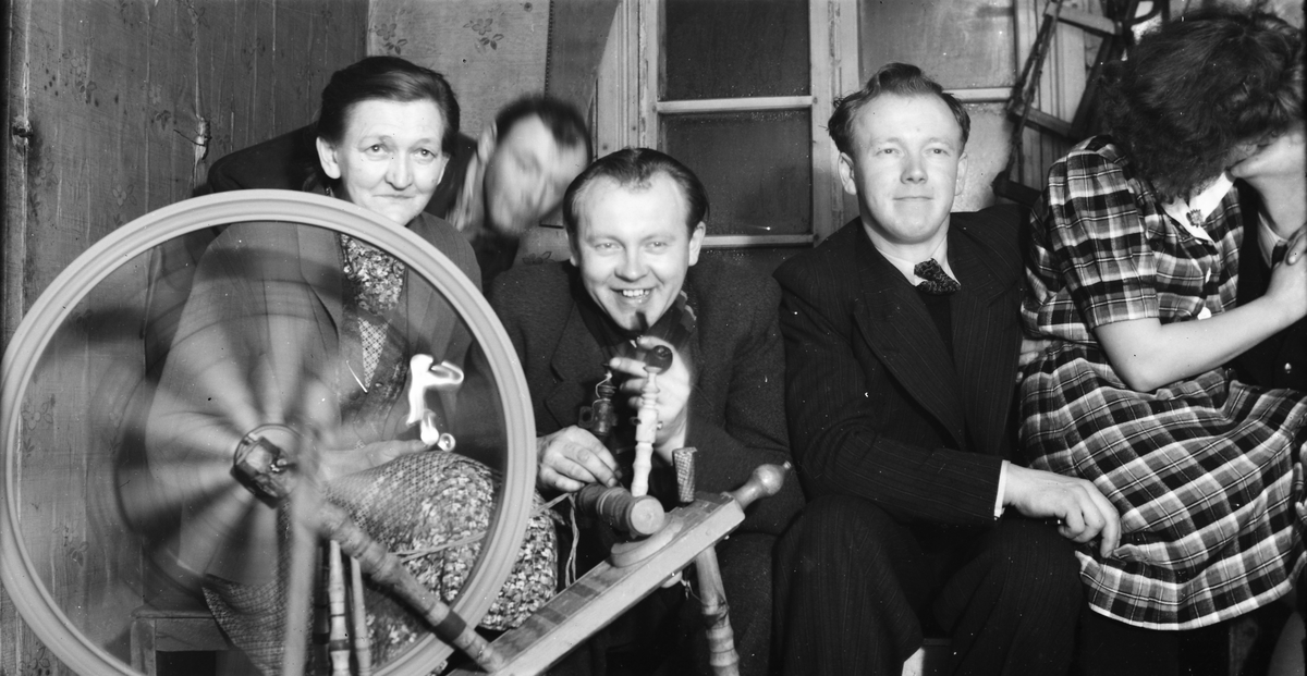 Festdeltagare skojar framför fotografen; spinnrocken snurrar, ett par kysser varandra och en man röker pipa. Den äldre kvinnan är Lundgrens Anna i Ry.