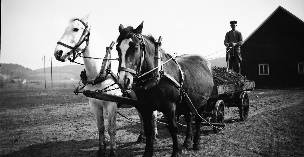 Gödselkörning på Kalvhult. Två hästar drar dynglasset med kusken baktill och en lada i bakgrunden.