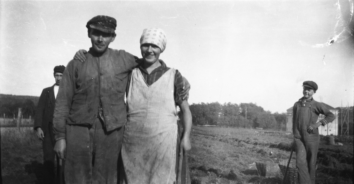 Kloar-Erik och Ellen i Kalvhult poserar på en potatisåker. I bakgrunden står en pojke och hänger på ett redskap bredvid ett par potatiskorgar. Bakom honom syns en kraftstation.