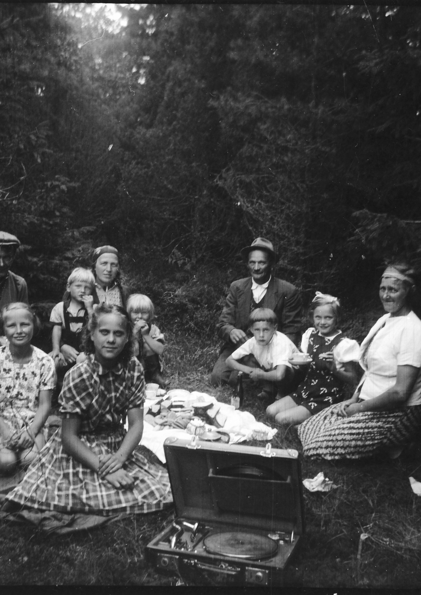 Tio personer har picnic i en skogsdunge med kaffepanna och kakor. I förgrunden står en grammofon (som fanns på Dämmarehult). Fr.v. Kerstin Johansson, sommarbarnet Ingrid, Emanuel Snyggs i hatt, Bo Svensson bakom flaskorna, Inga Maj Svensson med rosett, Elin Svensson.