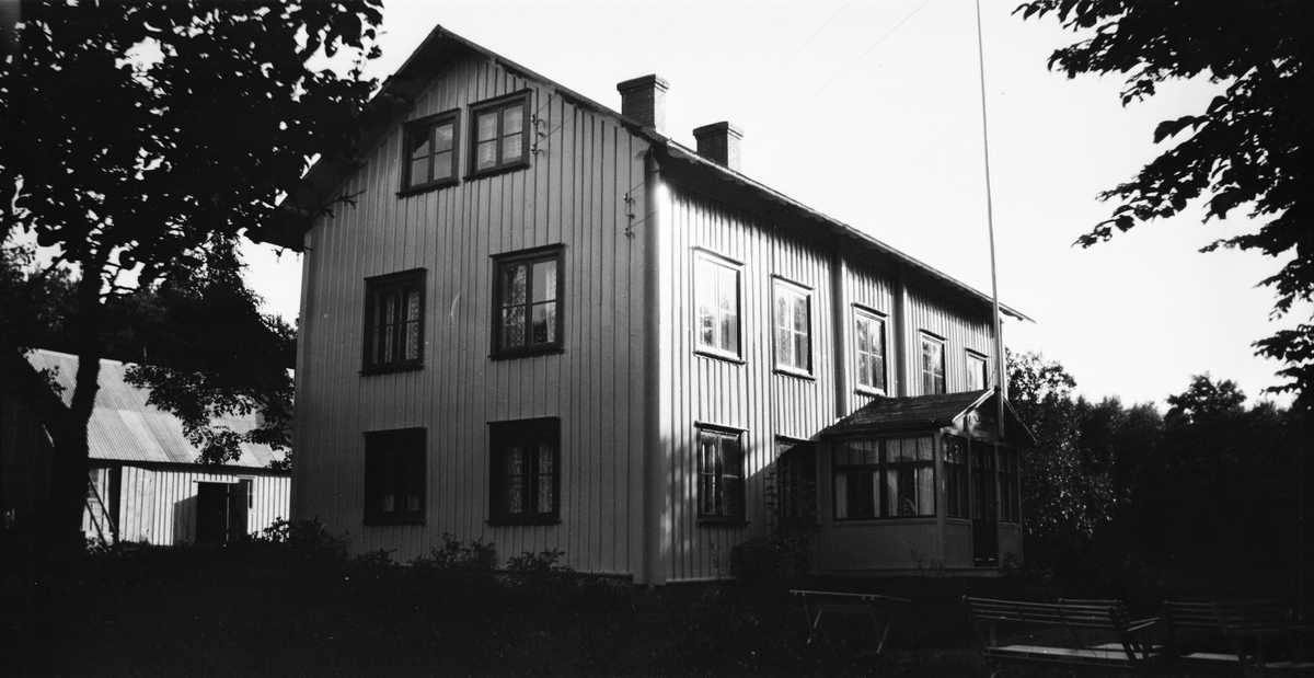 "Tranebergs hus, Varberg." Ett stort timrat tvåvåningshus med glasveranda, vid vars gavel en flaggstång är fästad. Elledningar löper från husets gavel och i bakgrunden skymtar en ladugård. I förgrunden står trädgårdsmöbler.