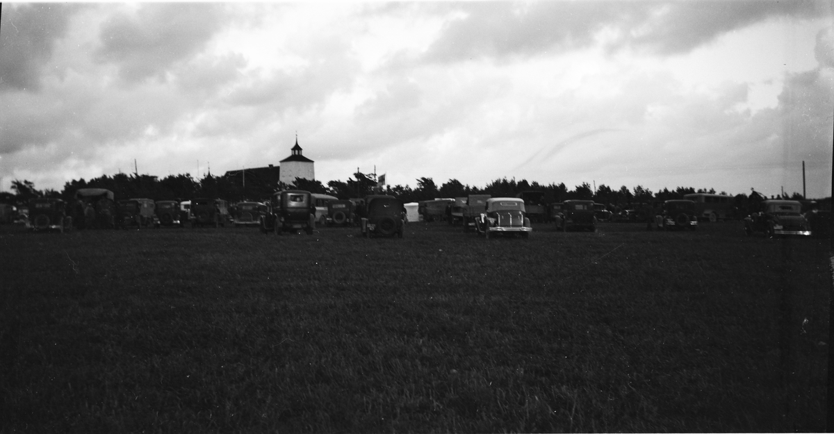 Mängder av bilar står uppställda på fältet som breder ut sig nedanför tornet på Onsala kyrka. Enligt uppgift ska det vara en biltävling.