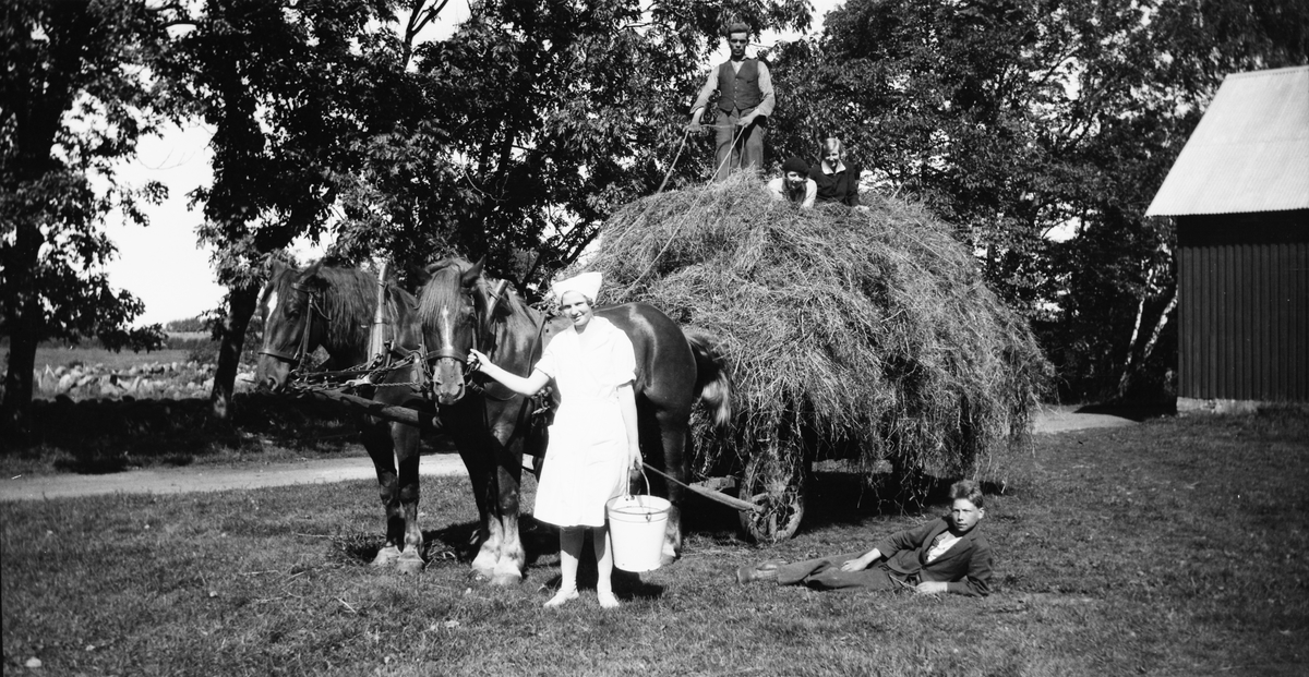 Hölass med två förspända hästar vid gårdsknuten. En vitklädd kvinna med hink håller i hästarna och på hölasset ligger två flickor och en yngling håller i tömmarna, medan en pojke ligger i gräset nedanför.