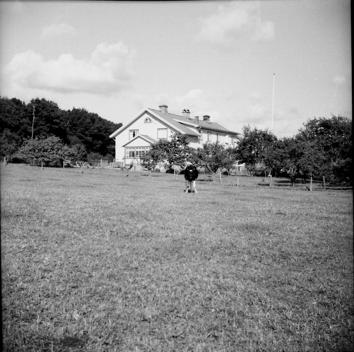Ålderdomshemmet i Thårstorp, Veddige, med en glasveranda på gaveln. Nedanför byggnaden breder en trädgård ut sig och på åkern i förgrunden står en ko.