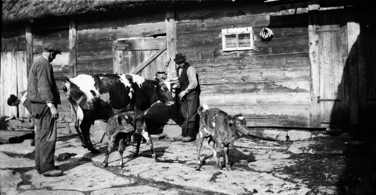 Syskonen Oskar (i hatt), Ivar och Selma med ko och tvillingkalvar på gårdsplanen, som är belagd med stenhällar. Ladugården är byggd i skiftesverk och täckt med stråtak. På väggen hänger hästskor.
