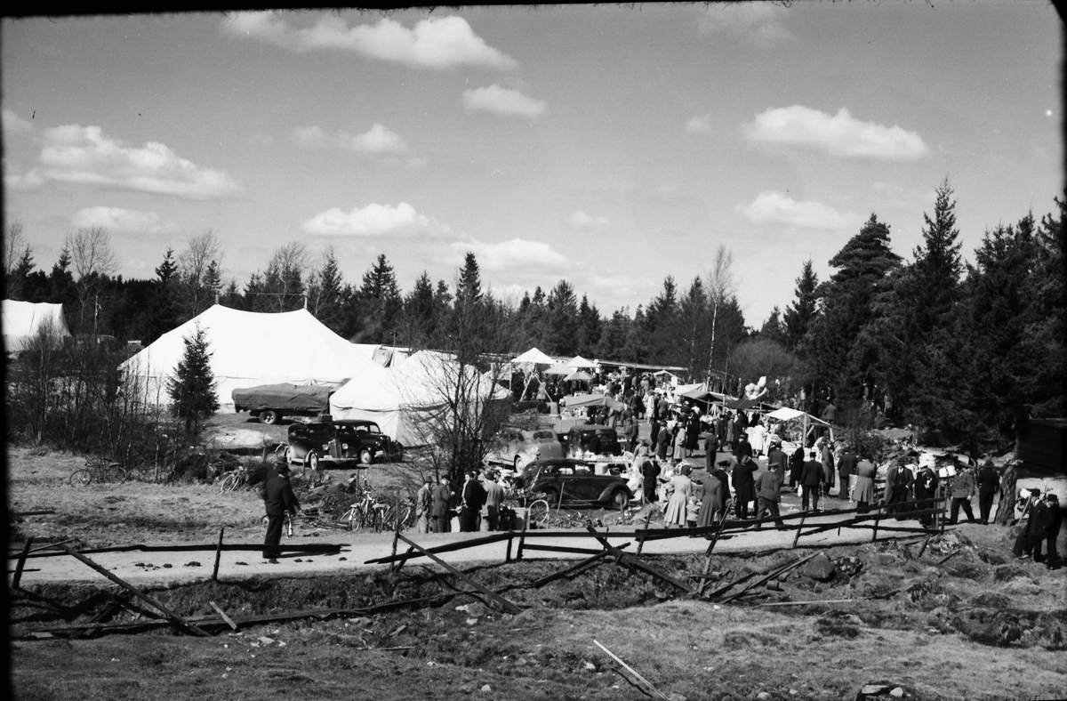 Skållareds marknad. Vy över marknaden med tält, marknadsstånd, svävande ballonger, bilar och besökare. I förgrunden går en liten väg fram till den skogskantade åkern och i diket har besökarna lagt sina cyklar.