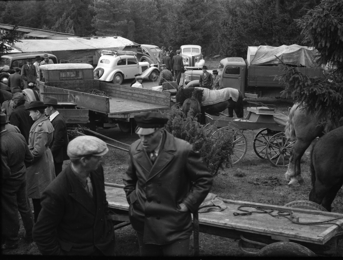 Skållareds marknad. Män som samlats bland bilar och kärror utanför marknadsstånden.