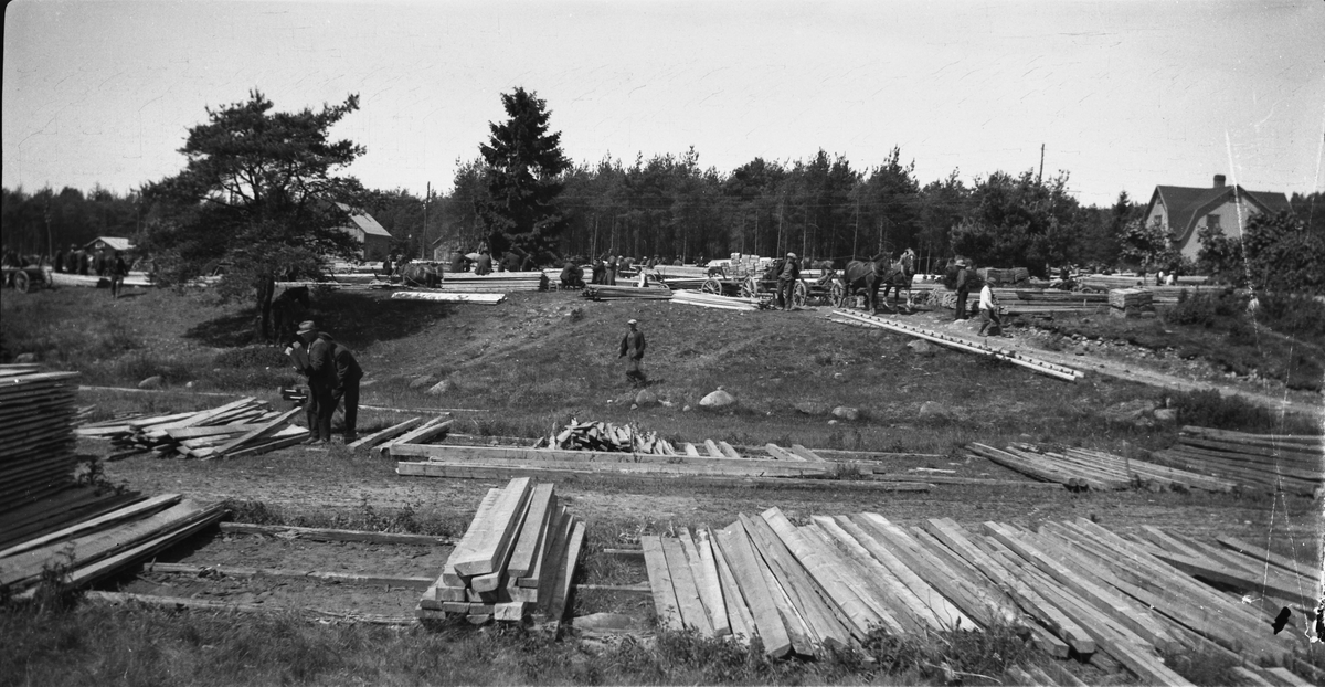 Virkesområdet på Skållareds marknad. Virke av olika slag och dimensioner ligger utspritt över en gräsbacke. I bakgrunden hästar med kärror, försäljare och spekulanter. Till höger ett bostadshus.