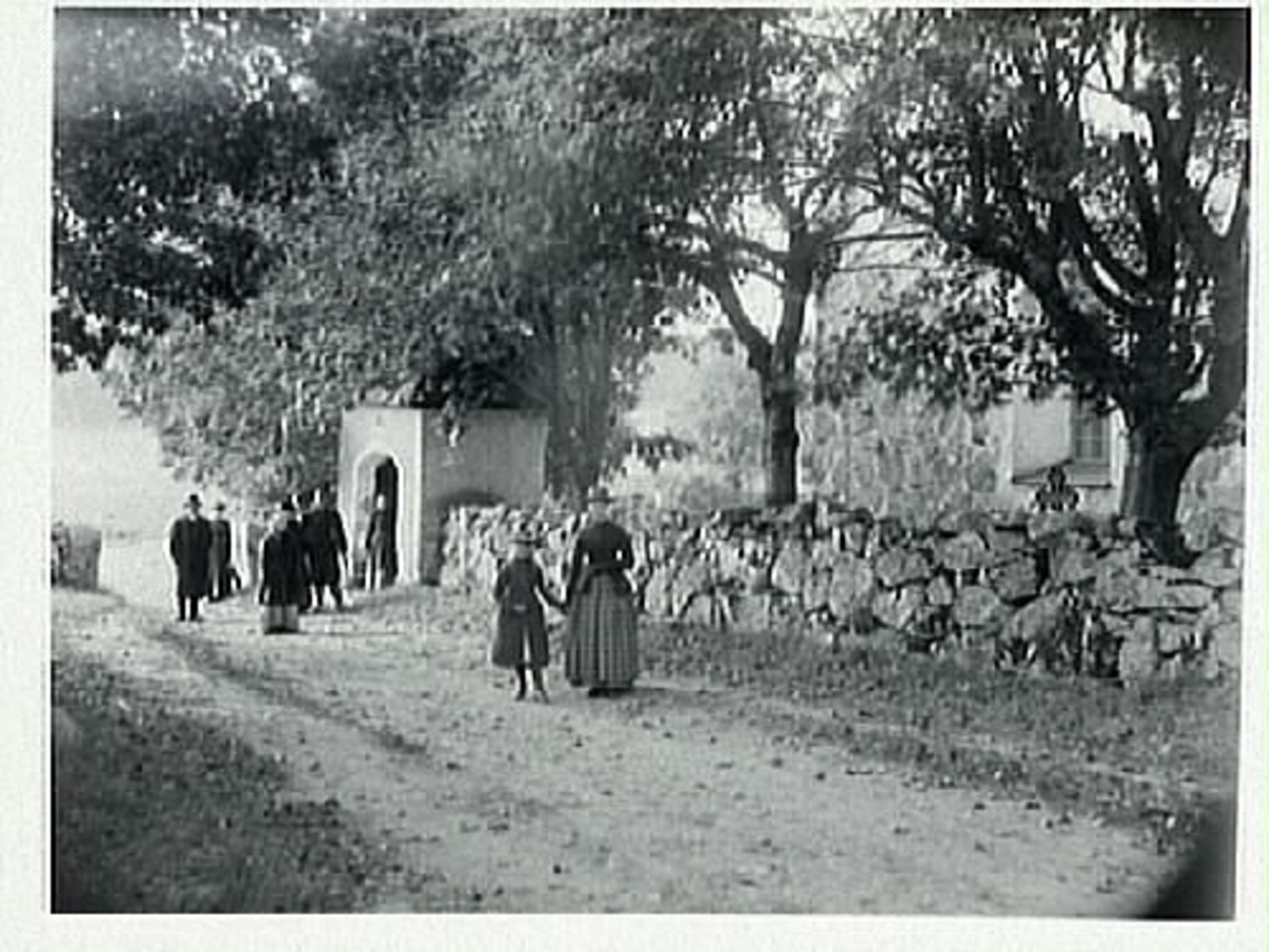 Finklädda människor utanför en stigport till kyrkogården, alla riktade mot fotografen.