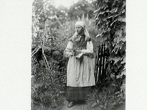 Kvinna i sockendräkt med psalmbok och blomsterbukett (liljekonvalj?). Hon står i en grindöppning.