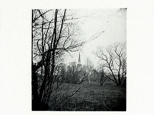 Mariefreds kyrka sedd på håll med hagmark i förgrunden, Södermanland. Naturvy.