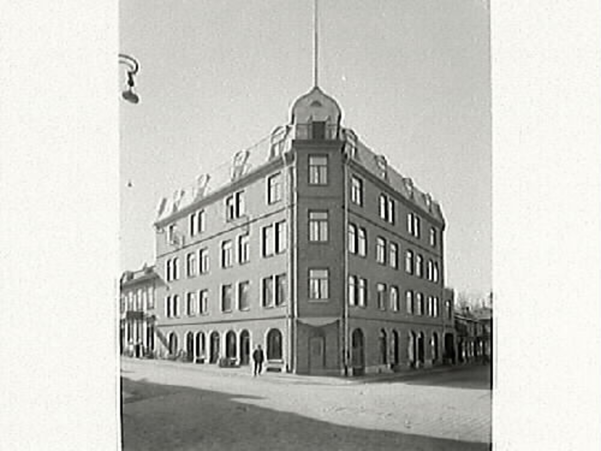 Byggnaden låg i hörnet Östra Långgatan-Kyrkogatan. Aron Svenssons hus. 1925.