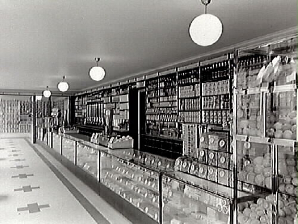 Interiör från Helge Nilssons speceriaffär, hörnet Borgmästargatan-Östra Långgatan, Kv Färgaren. En lång glasdisk där varor exponeras och kunderna kan betjänas. Bakom disken finns varorna på hyllor.