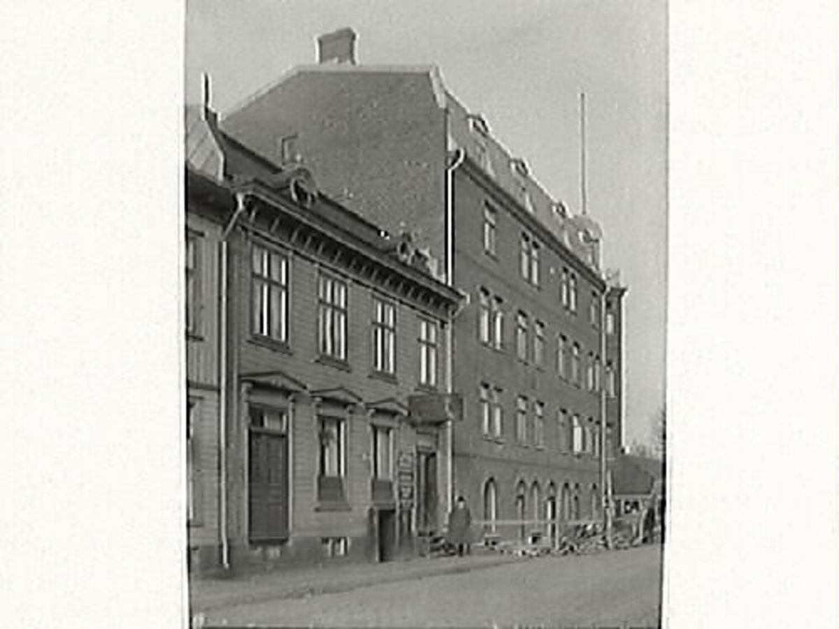 Trähuset till vänster är Folkrestaurangen, till höger ligger Aron Svenssons hus. Östra Långgatan.