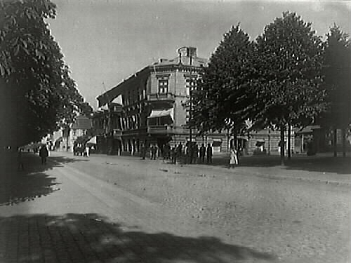 Byggnaden låg vid hörnet Kyrkogatan-Västra Vallgatan. Åke Jönssons fastighet. Exteriör. Bostadshus med affärer i bottenplan.