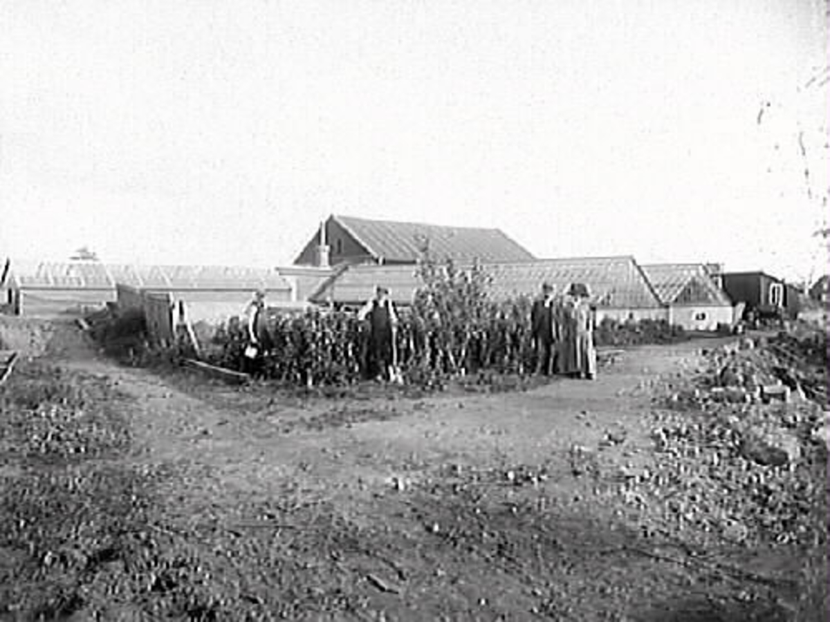 Trädgårdsarbete i Förstbergs handelsträdgård. Ett avsnitt av trädgården med växthus i bakgrunden.