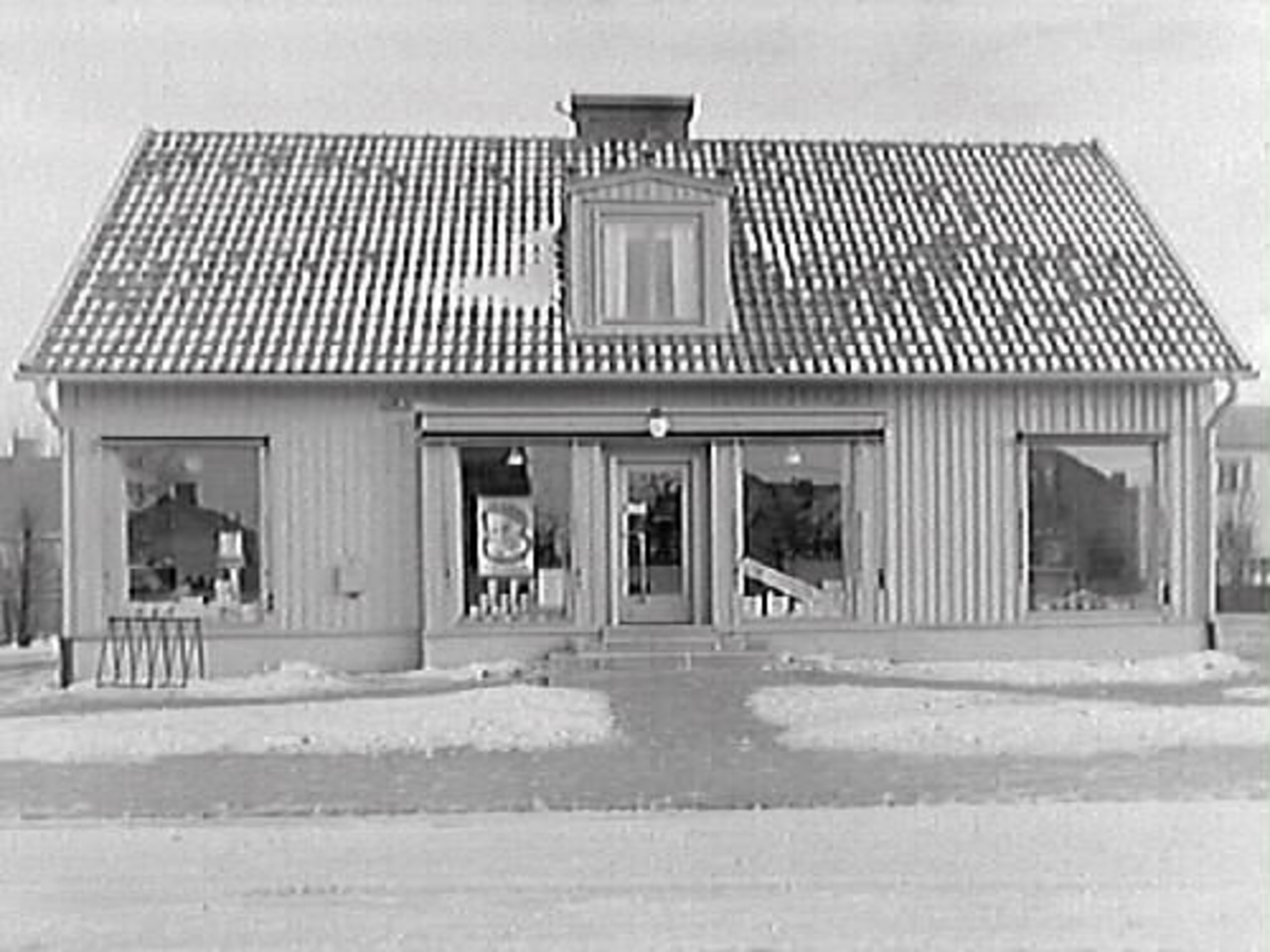 Kooperativa AB. Butiken låg i en fristående träbyggnad utmed Södra vägen, kv Gösen. Entrén ligger centrerad tillsammans med skyltfönster i ett svagt utskjutande fasadparti. Bilden är tagen på vintern, det ligger snö på marken.