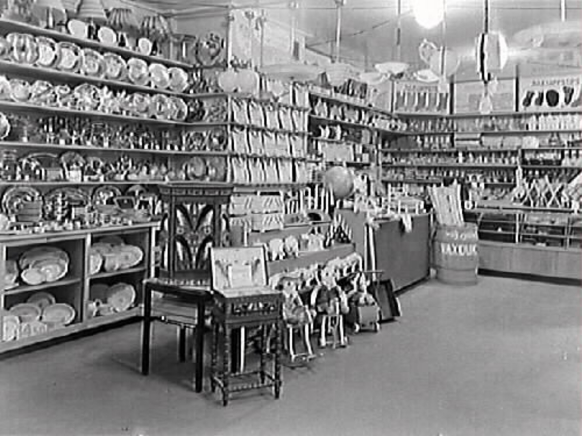 Kooperativa AB i hörnet Borgmästaregatan-Östra Långgatan. Interiör från butiken. I affären saluförs allehanda: Husgeråd, leksaker, kurbitsmålade möbler och lampor. Till höger i bild sitter en plansch uppe vid taket som visar styckningsdelar för köttvaror.