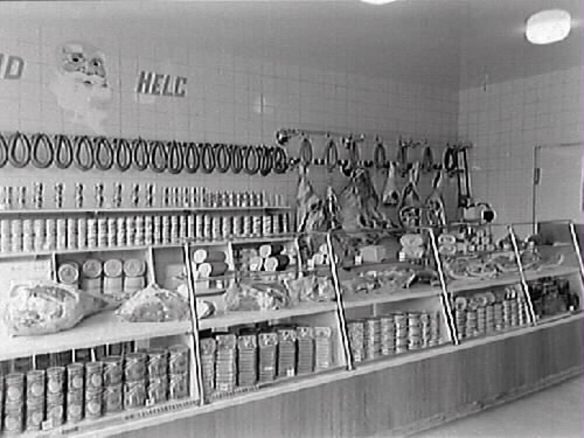 Interiör från Kooperativa AB charkuteriaffär i hörnet av Borgmästaregatan - Östra Långgatan. Affärsdisk och vägghyllor med varor, korvar hänger i rad på krokar liksom styckdelar.