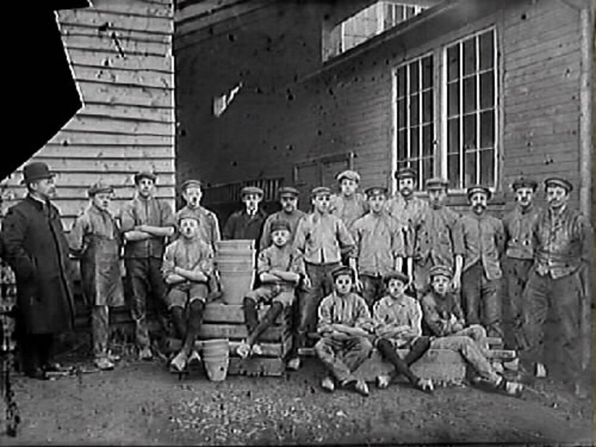 Arbetare och en herre i hatt vid Varbergs stenkärlsfabrik 1911.
