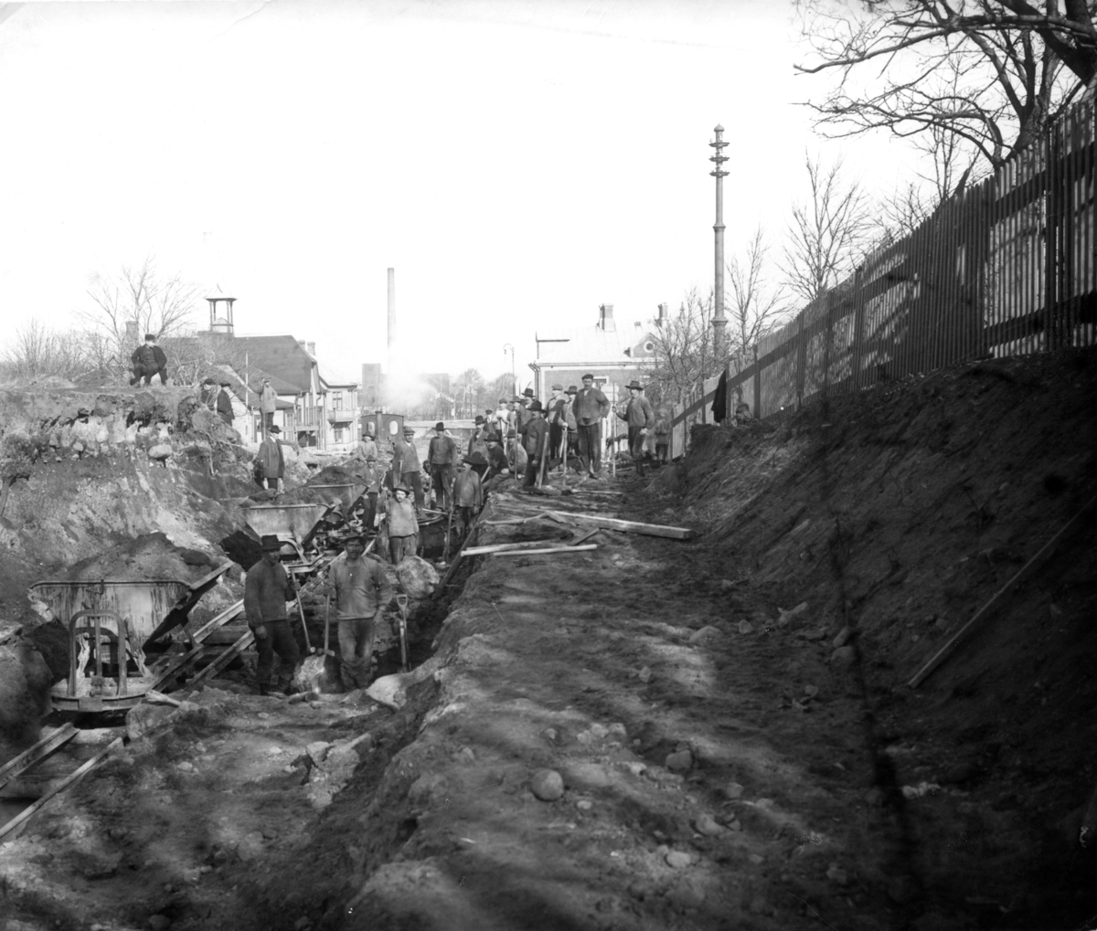 Här pågår anläggningsarbetet med den nya bansträckningen söderut från Varbergs station. Bilden är tagen väster om kvarteret Prästgården och i bakgrunden syns missionshuset i kv Skepparen. Järnvägsarbetarna använder handredskap och jordmassorna fraktas i vagnar som går på räls. Den nya sträckningen invigdes 1920.