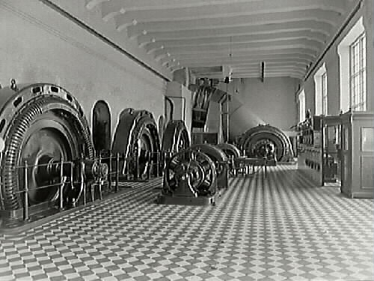 Ätrafors vattenkraftverk, aggregat 1. Interiör från turbinhallen. Kraftverket stod klart detta år, 1918, och ligger knappt 23 km uppströms från Falkenberg där man dämt upp en urgammal fiskeplats, Räveigeforsen. Yngeredsfors Kraft AB byggde också ett kraftverk ca 5 uppströms från detta och köpte 1922 även anläggningarna i Ätrafors.