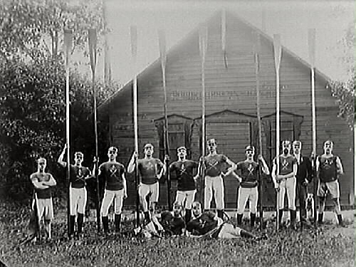 Troligtvis Halmstads Roddklubb. 12 roddare i full mundering och resta åror uppställda framför klubbhuset.