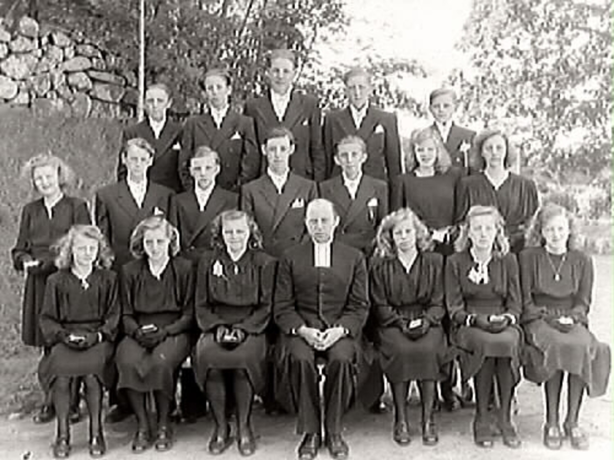 Prästen Elmqvist (i mitten) med komfirmander från Rolfstorp och Grimeton socknar. Bilden är tagen utomhus.