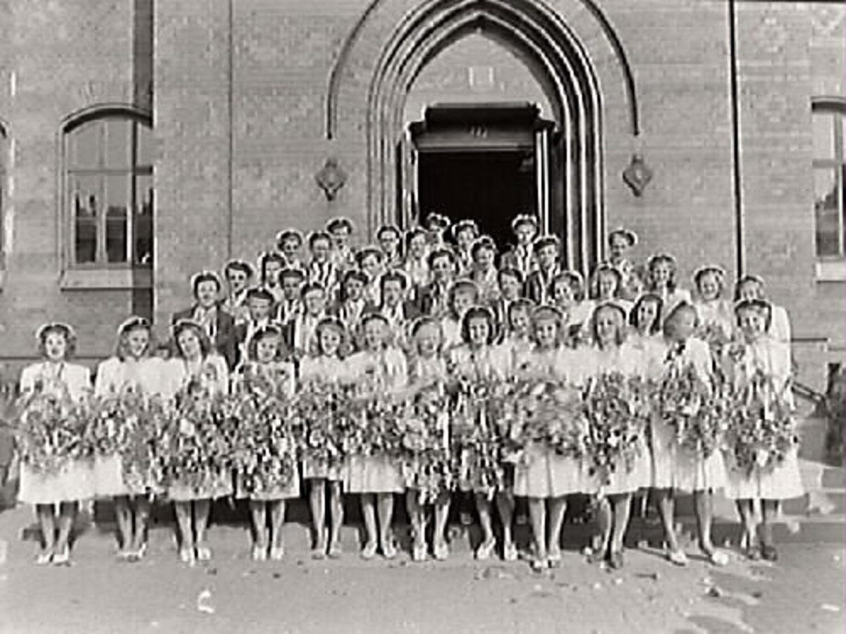1:a raden från vänster: Kerstin Larsson, Astrid Hjertstrand, Sonja Persson, Margot Nilsson, Inga-Lisa Stener, ?, Eva Mellqvist, Marianne Sandberg, Ingrid Ekström, Inga Andersson, Birgit Bengtsson. 2:a raden från vänster: ?, Vera Johansson ? från Långås, Gunnel Karlsson, Elsie Stener, Elinor Johansson, Birgit Johansson, Siv Johnsson.