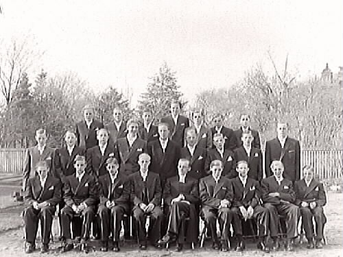 I mitten står prästen Backlund. Samma motiv som neg.nr. GB1:188 Från vänster sittande: Lennart Berntsson, Arne Karlsson, Antonsson, Rune Karlsson, Olle Andersson, Sune Gyllén, Ivar Antonsson, Ingvar Johansson. 2:a raden: Leif Johansson, Liss Bengtsson, Lars Camitz, Lasse Börjesson, Jarl Mether, Sven Andersson, Gust Axelsson, Nils Niklasson, Lars Olof Johansson. 3:e raden: Bengt Bengtsson, Leif Thelin, Arne Nilsson, Karl-Erik Johansson, Ingemar Andersson, Bengt Larsson, Yngve Johansson.