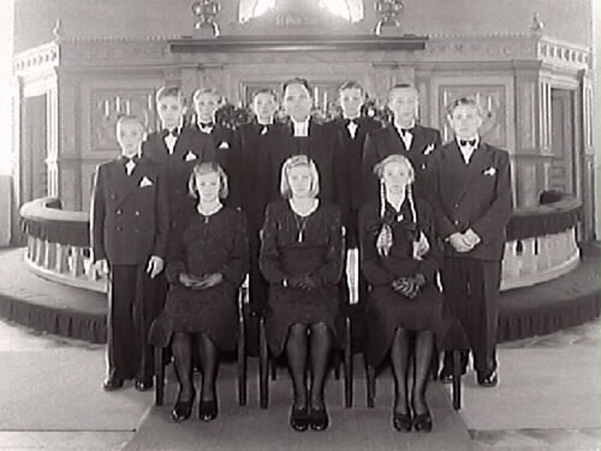 Kyrkoherde Åke Wetterqvist och komfirmander från Valinge och Stamnareds socknar framför altarringen i Valinge kyrka. Stående fr v Erik Svensson, Valinge, Louis Vallenberg, Valinge, Sigurd Otterdahl, Valinge, Sven-Erik Andersson, Valinge, Folke Bengtsson, Stamnared, Kenny Andersson, Stamnared, Sven Karlsson, Stamnared.Sittande fr v Doris Gustavsson, Stamnared, Gunvor Gustavsson, Stamnared och Karin Henriksson, (gift Larsson) Valinge. Uppgiftslämnare Karin Larsson (f Henriksson) Kråkarp, Valinge, 2000.
