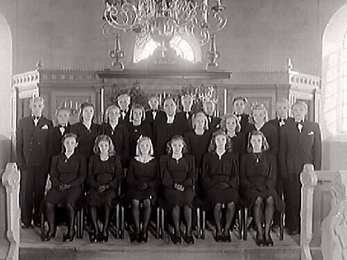 Konfirmandgrupp i koret med prästen Wetterkvist i mitten.
