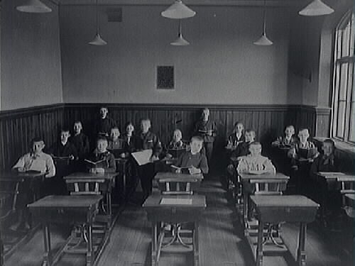 Skolklass med pojkar. Södra eller norra folkskolan. Två elever står vid väggbröstningen längst bak, en pojke står mellan två bänkrader och övriga sitter med uppslagna böcker i sina bänkar. I taket hänger s k skomakarlampor.