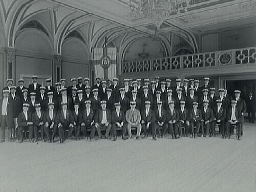 "Manskören Hallands sångarförbund. Kören bestod av personer från Halmstads sångarförbund, Varbergs musiksällskaps manskvartett, Falkenbergs manskör och Laholms manskvartett. De har just uppfört de sånger som de skulle sjunga vid Olympiska spelen i Stockholm under juli månad. Körsammansättningen gick under namnet Olympiakören."
