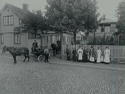 G. Rymans bryggeri sett från gatan. Två hästkärror med tunnor står i staketportalen. Stående vid vagnen är herr Ryman; vid staketet med pinne i hand bryggare Andersson; kvinnan i mitten med mörk klänning är fru Ryman med lilla barnet Bertil Ryman bredvid sig; flickan med långt hår är Kerstin Ryman. Bilden tagen mot söder, från Prästgatan.