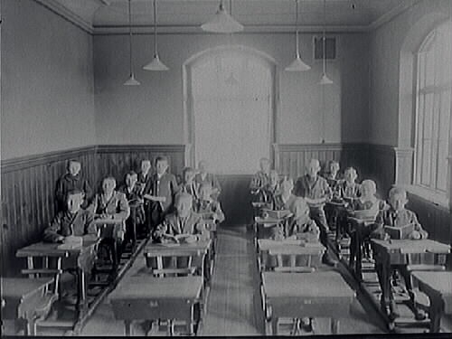 En skolklass med pojkar som sitter i skolbänkarna. Några står som om de ska svara på frågor, men magistern sitter också i en av bänkarna. Klassrummet har träboasering och i taket hänger flera så kallade skomakarlampor.