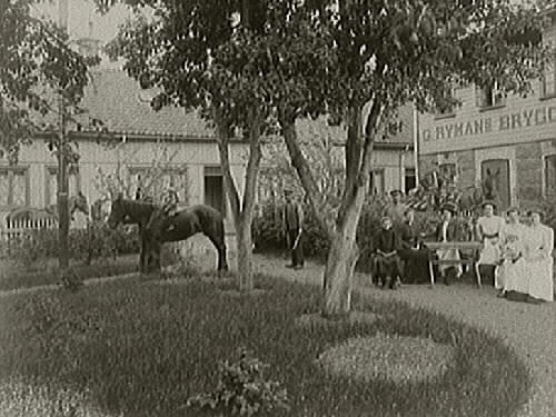 G. Rymans bryggeri, inne på gården där fruktträd står i blom eller har fällt sina blad och gjort marken prickig. En grupp människor är samlade i en soffgrupp på den sandade gången runt gräsmattan i mitten. En liten pojke, Bertil Ryman, sitter på en häst och ett par hästekipage med tunnor står vid husen bakom staketen. Mannen mellan träden är bryggare Andersson och herr Ryman står till vänster om bordet med sin fru sittande nedanför sig med stort halssmycke. Bredvid henne en ung kvinna i enorm hatt med lilla Kerstin Ryman intill sig. Bilden tagen mot söder, från Prästgatan.