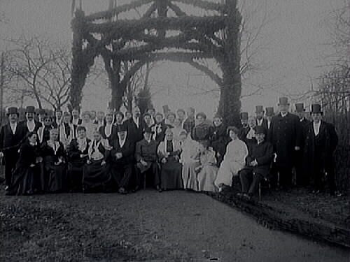 Högtidsklädda äldre kvinnor och män som står och sitter utomhus vid en lövklädd, fyrsidig äreport. Centralt i bild sitter ett äldre par, så kanske det är ett guldbröllop eller liknande som firas? Uppgifter saknas.
