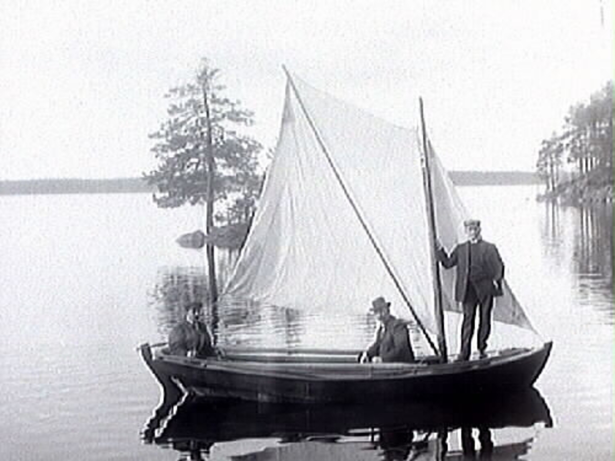 Tre män i en segelbåt på en spegelblank sjö. En av personerna på bilden är Gunnar Håkansson.