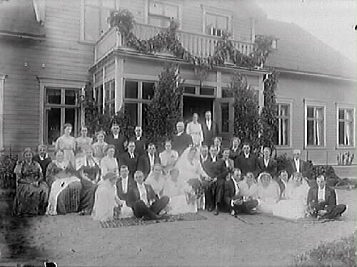 Brudpar med bröllopsgäster samlade utomhus vid lövprydd veranda till ett stort trähus. Balkongen ovanpå pryds av en girland. Personerna längst fram sitter på mattor i sanden.