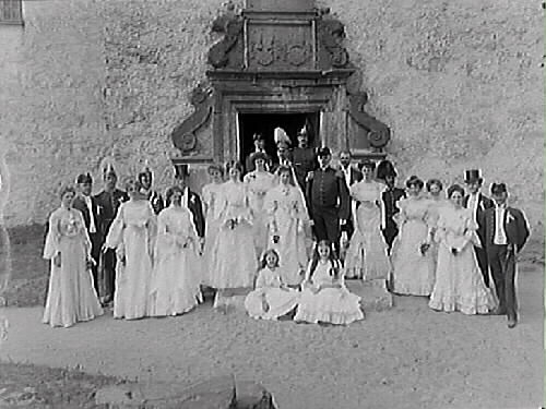 Brudpar med bröllopsgäster framför en pampig barockportal. Brudgum och några gäster bär uniformer.