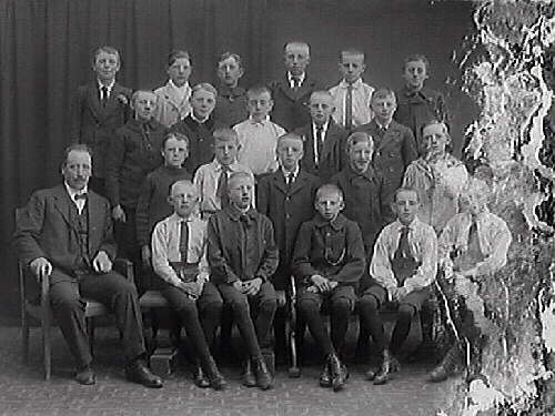 Pojkklass med lärare. (Negativet är skadad i högerkanten)