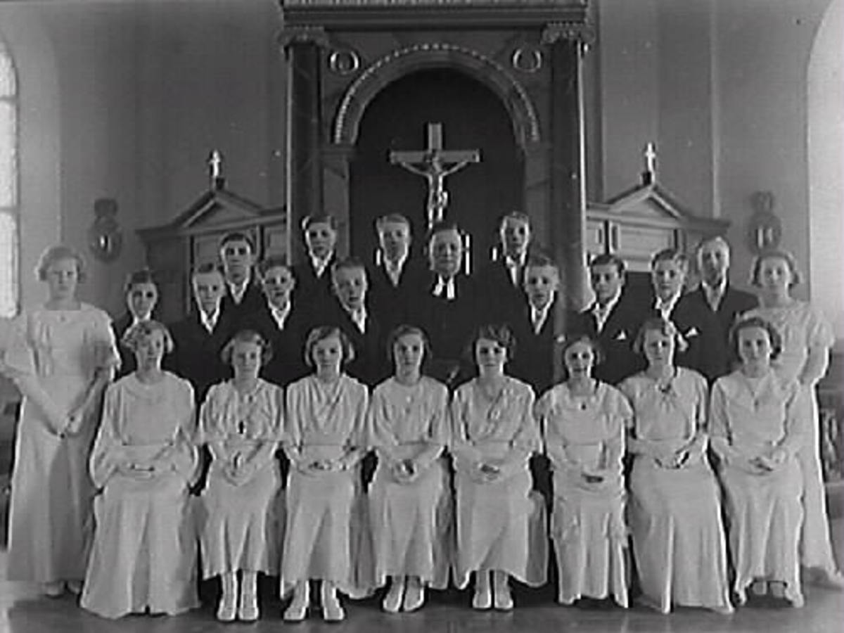 Interiör från koret i Varbergs kyrka, konfirmation 1935. Komminister Sven Gunnar Aronius (i mitten) med konfirmandgrupp. Från vänster, flickorna: Ulla Roswall, Gunnel Larzenius, Barbro Hylmö, Gullan Johansson från Stafsinge, Inga-Kerstin Svensson från Harplinge, Birgit Hallberg, Evy Antonsson från Tvååker, Gudrun Lauritzon, Lilli Svensson. Mellersta raden, pojkarna: Artur Lindberg, Alf Andersson-Ulmeborn från Okome, Lennart Bengtsson, Nils Liljegren, Karl-Erik Hansson, Filip Nilsson, Sven Wildheim, Erling Johansson. Översta raden: Per-Olof Johansson från Göteborg, Stig Svensson från Stafsinge, Lennart Olsson, Torsten Lennart Olsson från Stafsinge.