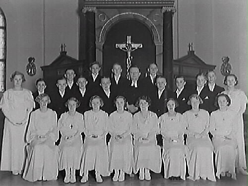 Konfirmandgrupp med prästen vid altaret.