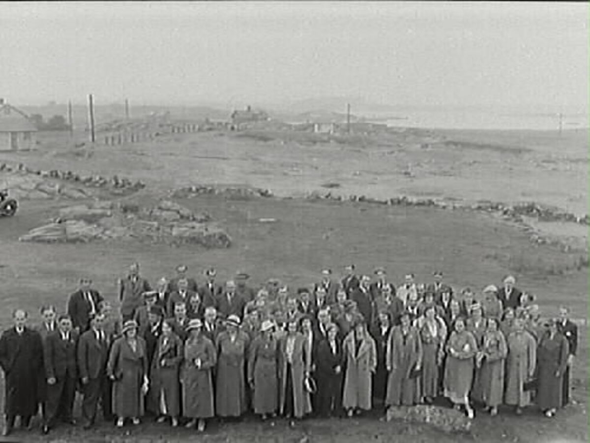 En stor grupp med återförsäljare inom Monark från hela Sverige, vid ett besök på Getterön. De står nedanför berget i 4:e vik där Sunds restaurang (senare restaurang Kattegatt) låg. 3:e vik och några byggnader syns i bakgrunden.