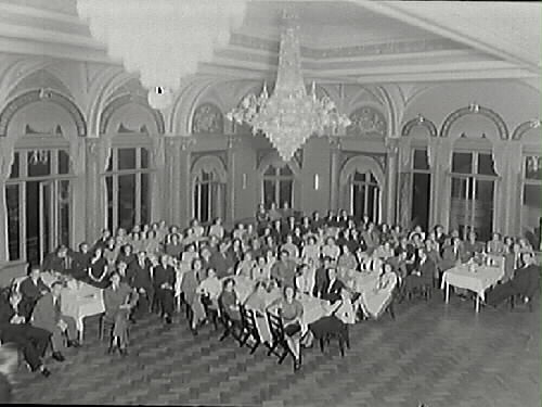 Interiör från Stadshotellet med vy över gäster sittande till bords i sal med höga fönster med dekormålade omfattningar, kristallkronor och fiskbensparkett.