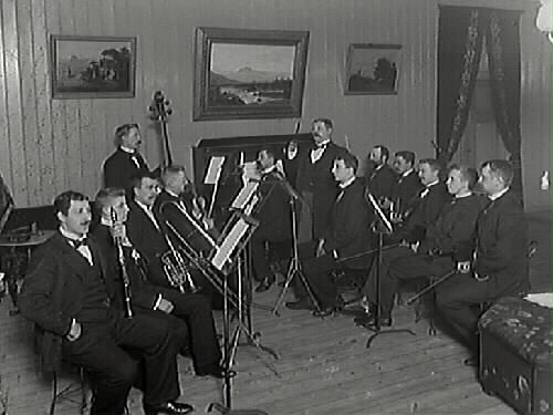 Okänd orkester repeterar i sal med tavlor pä väggen.