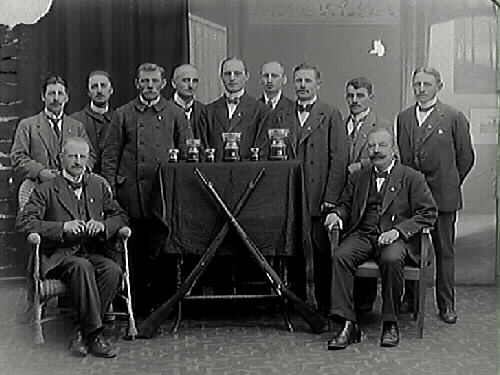 Skytteförening uppställd i fotoateljé kring podium med gevär och prispokaler.